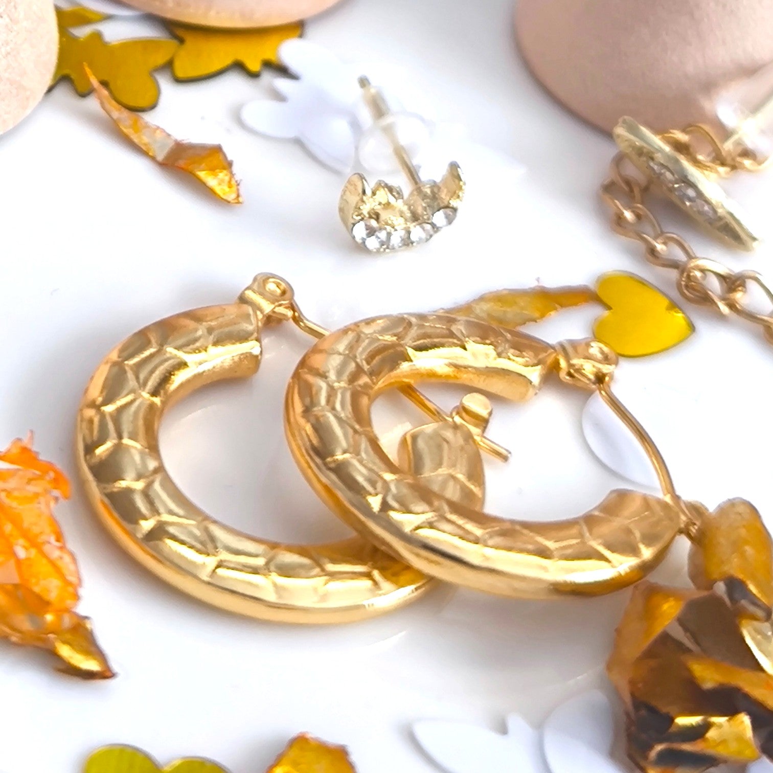 Estos aretes de aro con dibujo de piel de serpiente aportan un toque moderno y audaz a cualquier look. Combínalos con blusas, vestidos o chaquetas de colores neutros para resaltar la textura y el brillo dorado, o con conjuntos minimalistas que busquen elegancia y sofisticación. Funcionan perfectamente con peinados recogidos o semi-recogidos que permitan lucir su diseño único, y se pueden complementar con collares finos o pulseras doradas para un estilo armonioso y chic.