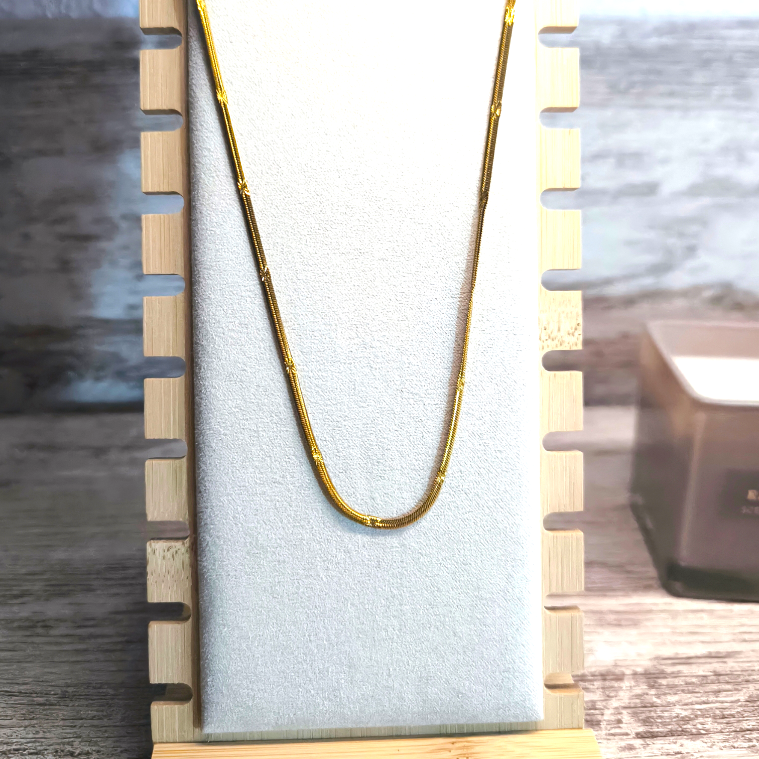 El Collar Sérénité Cilindros & Figaro combina la durabilidad del acero inoxidable 202 con un chapado en oro auténtico de 18 quilates mediante recubrimiento PVD, garantizando un brillo resistente y duradero. Su cadena fina, intercalada con cilindros dorados, aporta un toque sofisticado y femenino, ideal para quienes buscan un accesorio minimalista pero lleno de detalles elegantes. El cierre con gatillo de langosta asegura seguridad y comodidad en cada momento del día.